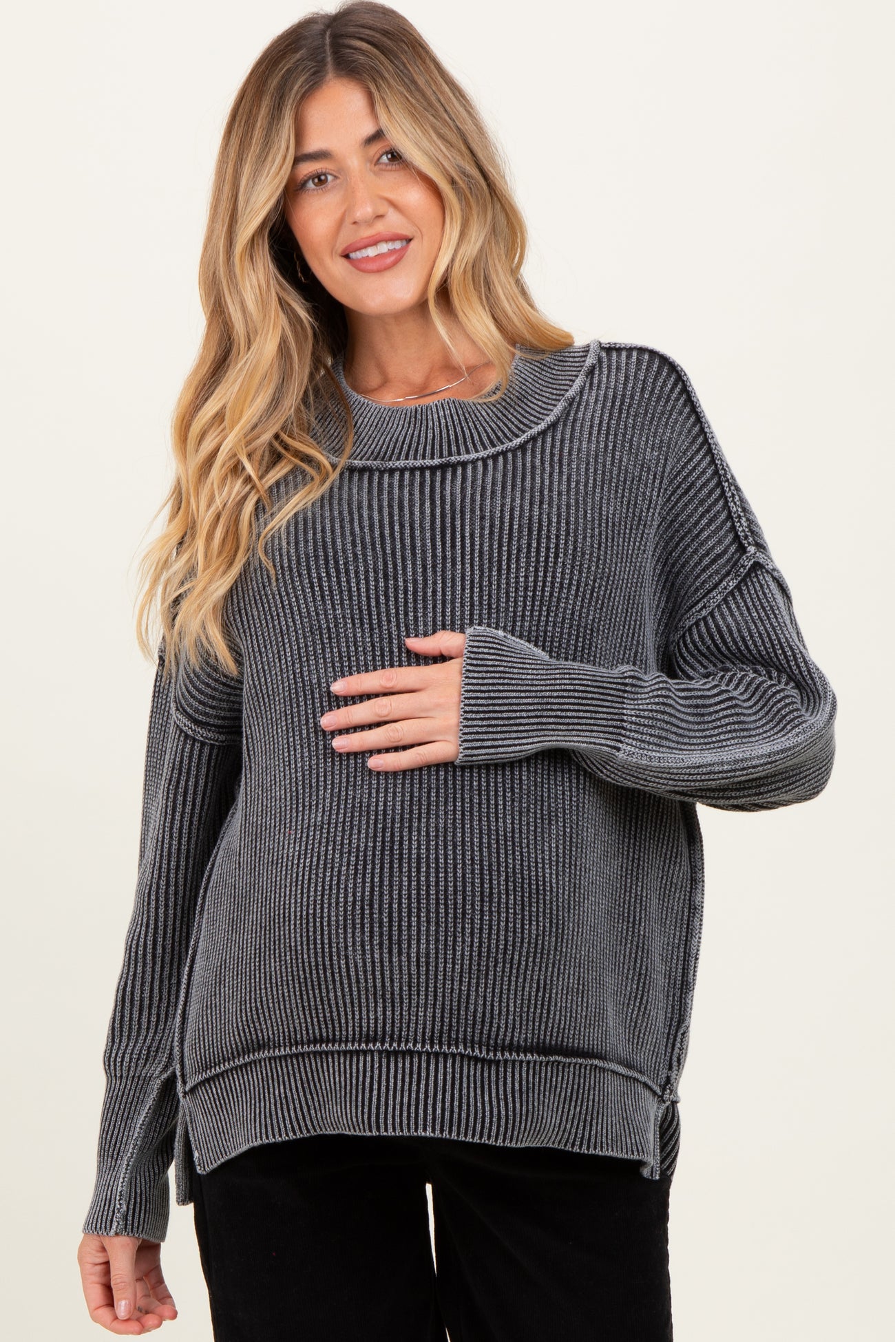 Stay cozy and stylish with our Washed Side Slit Oversized Maternity Sweater. Designed for ultimate comfort, this sweater features a relaxed fit and trendy side slits for easy movement as your bump grows. The soft, lightweight fabric drapes beautifully, making it perfect for layering over your favorite maternity basics. Whether you're lounging at home or heading out for errands, this everyday essential adds effortless style to your maternity wardrobe. Pair it with jeans or leggings for a laid-back, chic look that keeps you comfortable from bump to baby and beyond.
