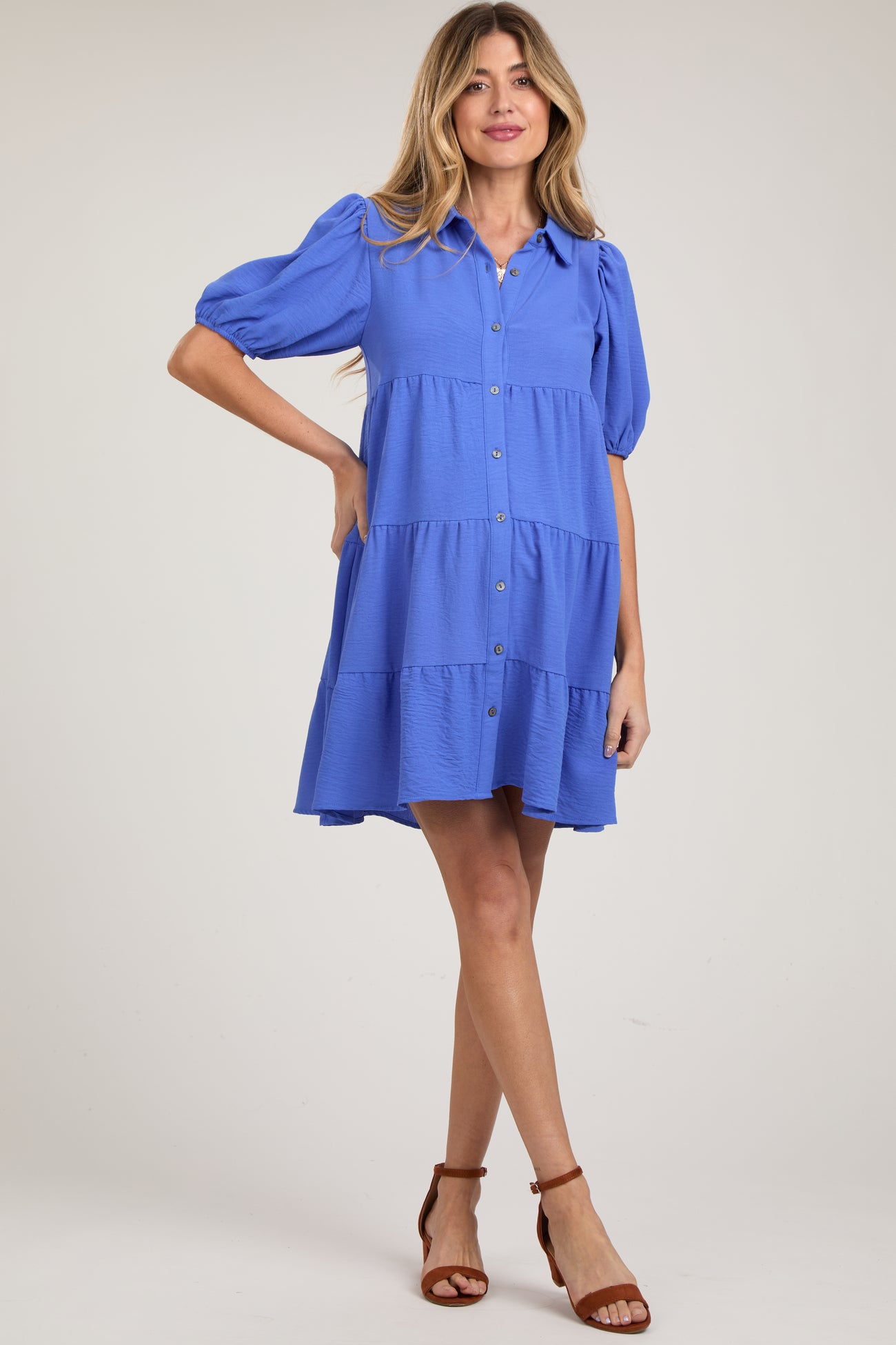 A solid hued maternity dress featuring a button-down front, a tiered body, short puff sleeves and a collared neckline.