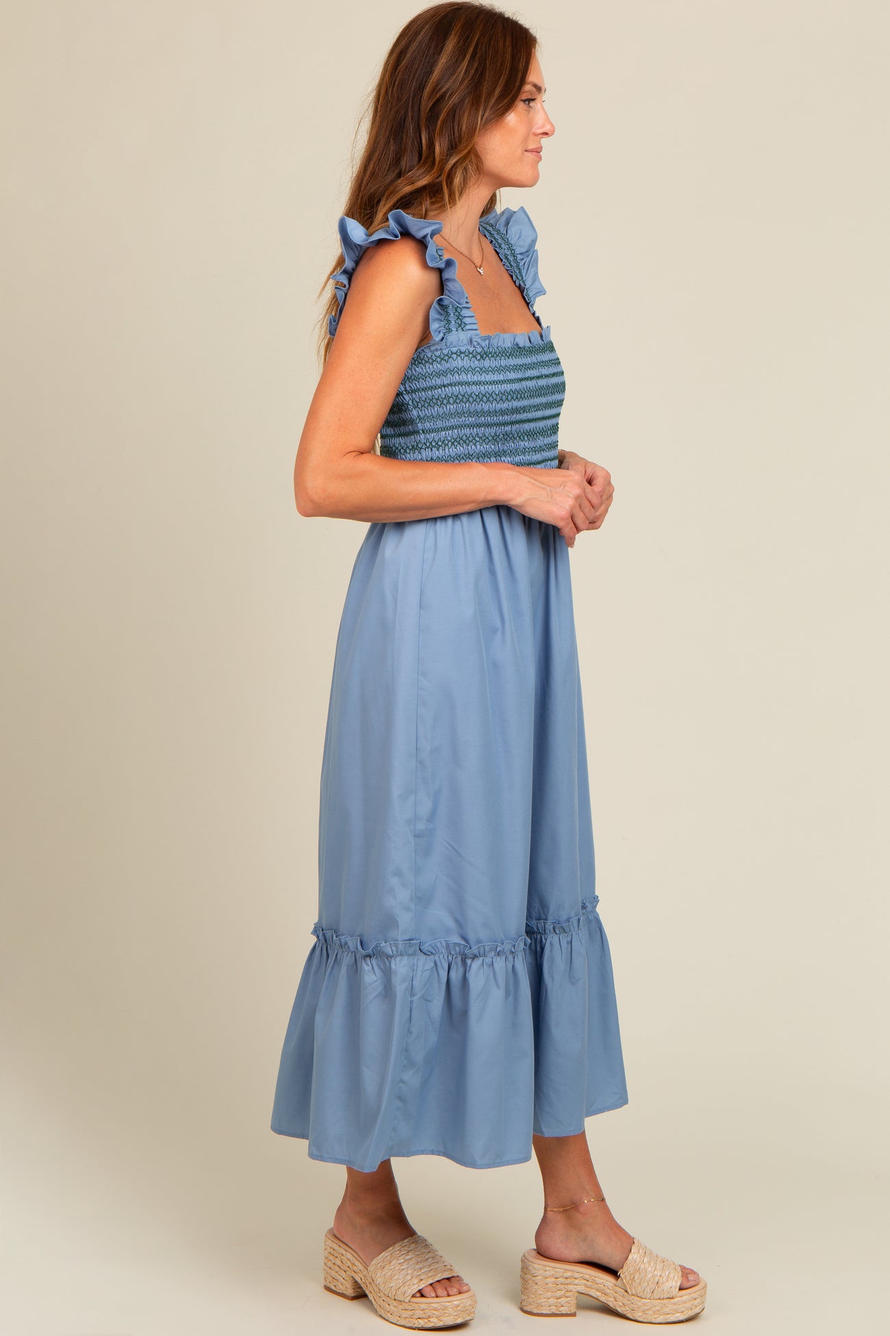 Blue Contrast Stitch Smocked Ruffle Strap Midi Dress