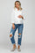 A pair of medium wash maternity jeans featuring distressed cutouts, a crop length cuffed hem, 5 pockets and an elastic belly band.