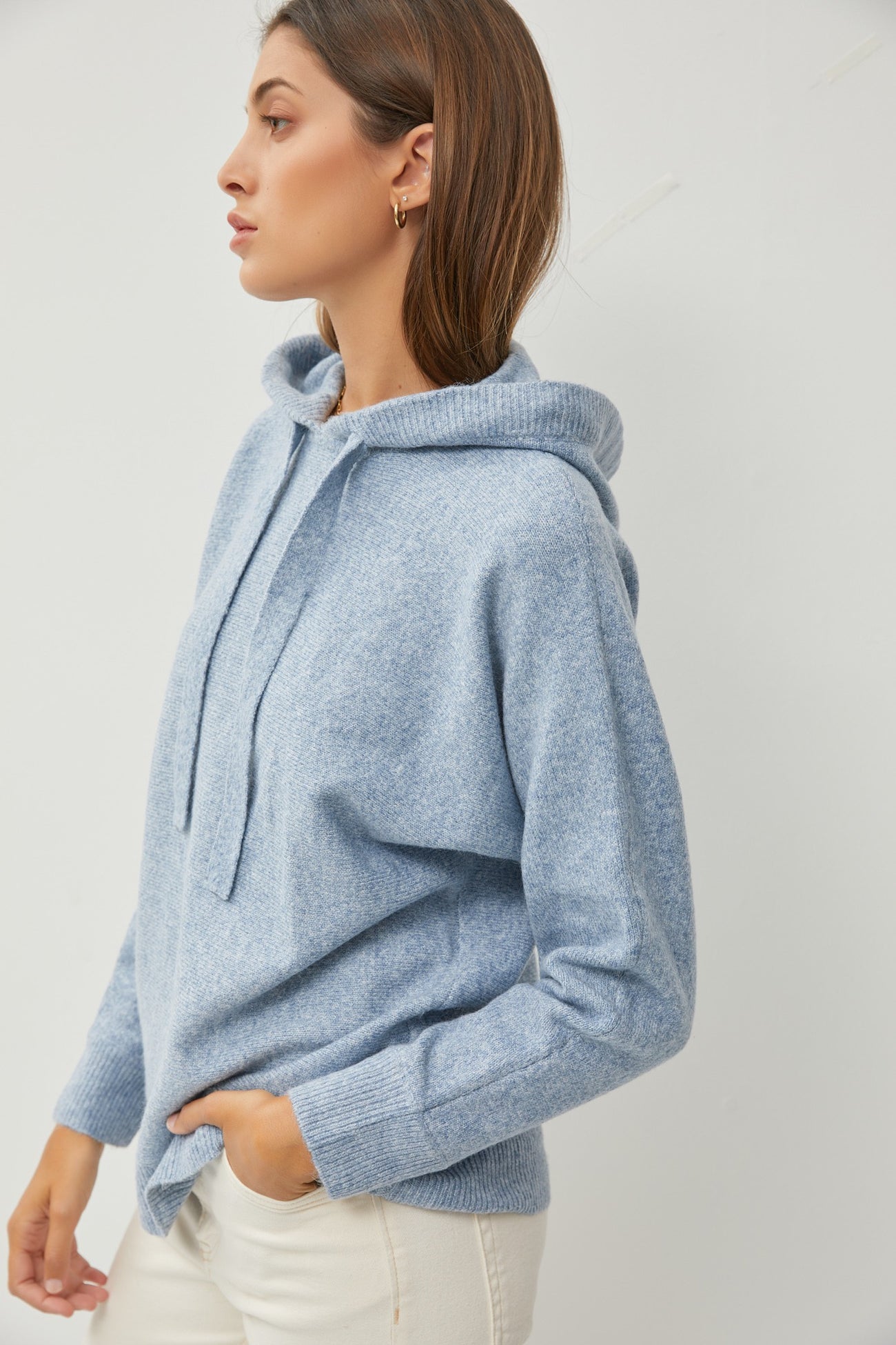 A soft knit sweater featuring an adjustable drawstring, a hood and long sleeves.