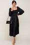 A floral print fitted maternity midi dress featuring a smocked body, a square neckline, adjustable cami straps and ruffled tiers.