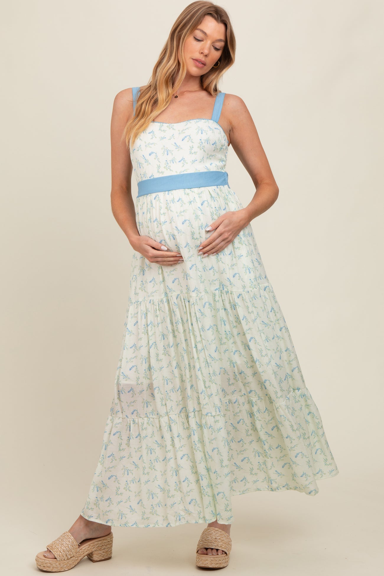 Blue Floral Contrast Sash Tie Maternity Maxi Dress