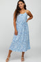 A floral print pleated maternity midi dress featuring a rounded neckline, a racerback, adjustable cami straps and an adjustable waist tie.