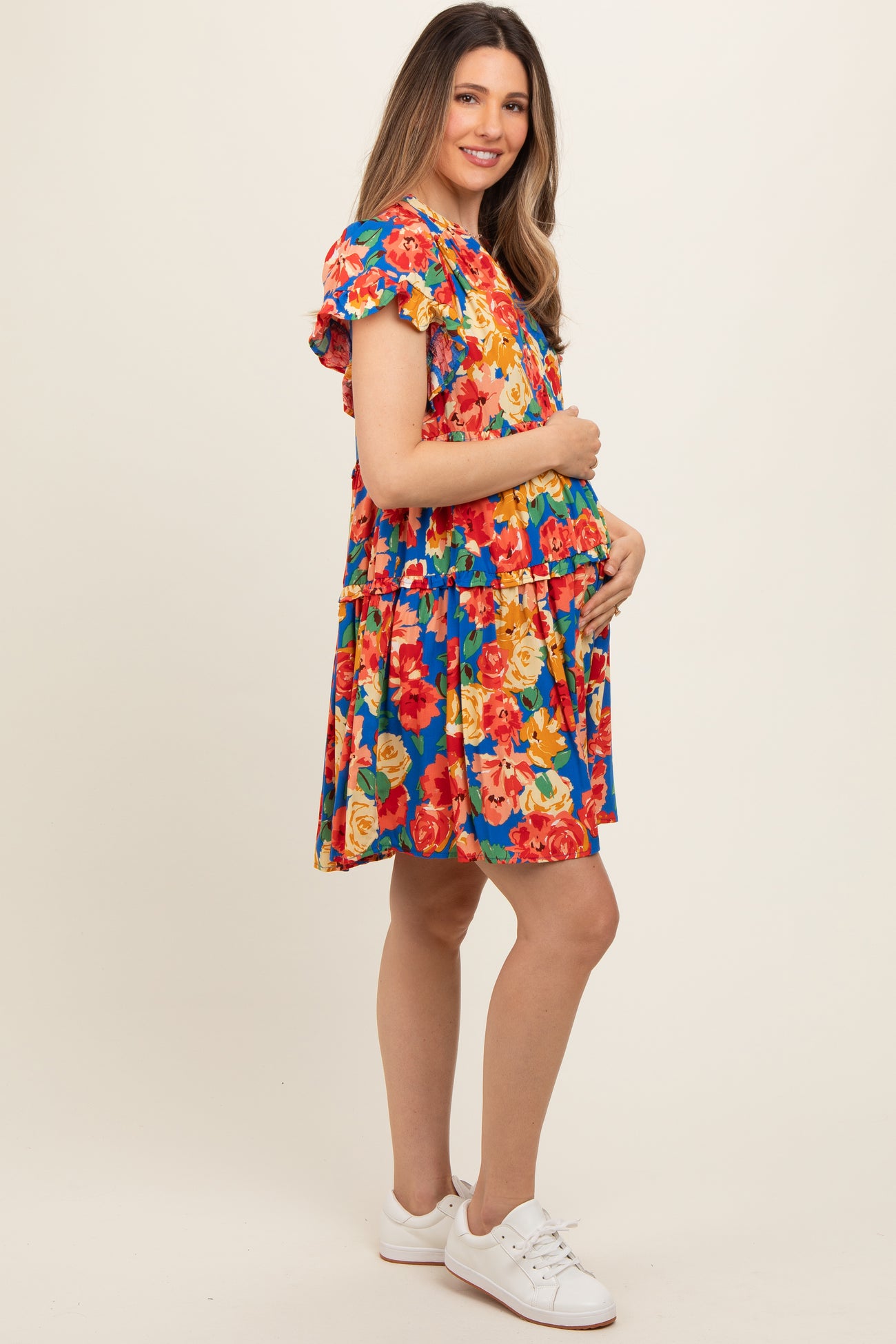 Blue Floral Ruffle Tiered V-Neck Maternity Dress