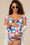 Blue Floral Ruffle Trim Ruched One-Piece Maternity Swimsuit