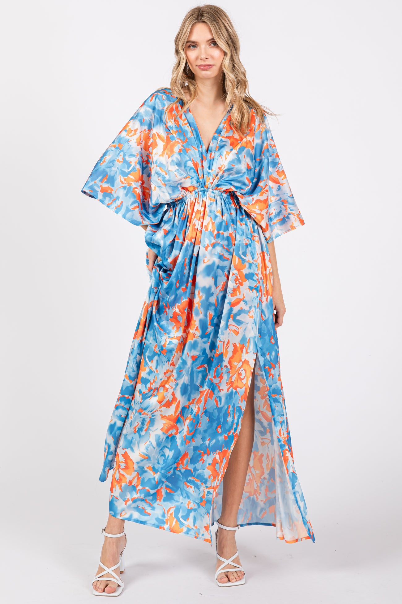 A satin floral maxi dress featuring a v-neckline, short dolman sleeves, an elastic waist, and two front slits.
