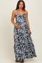 Blue Floral Smocked Shoulder Tie Midi Dress