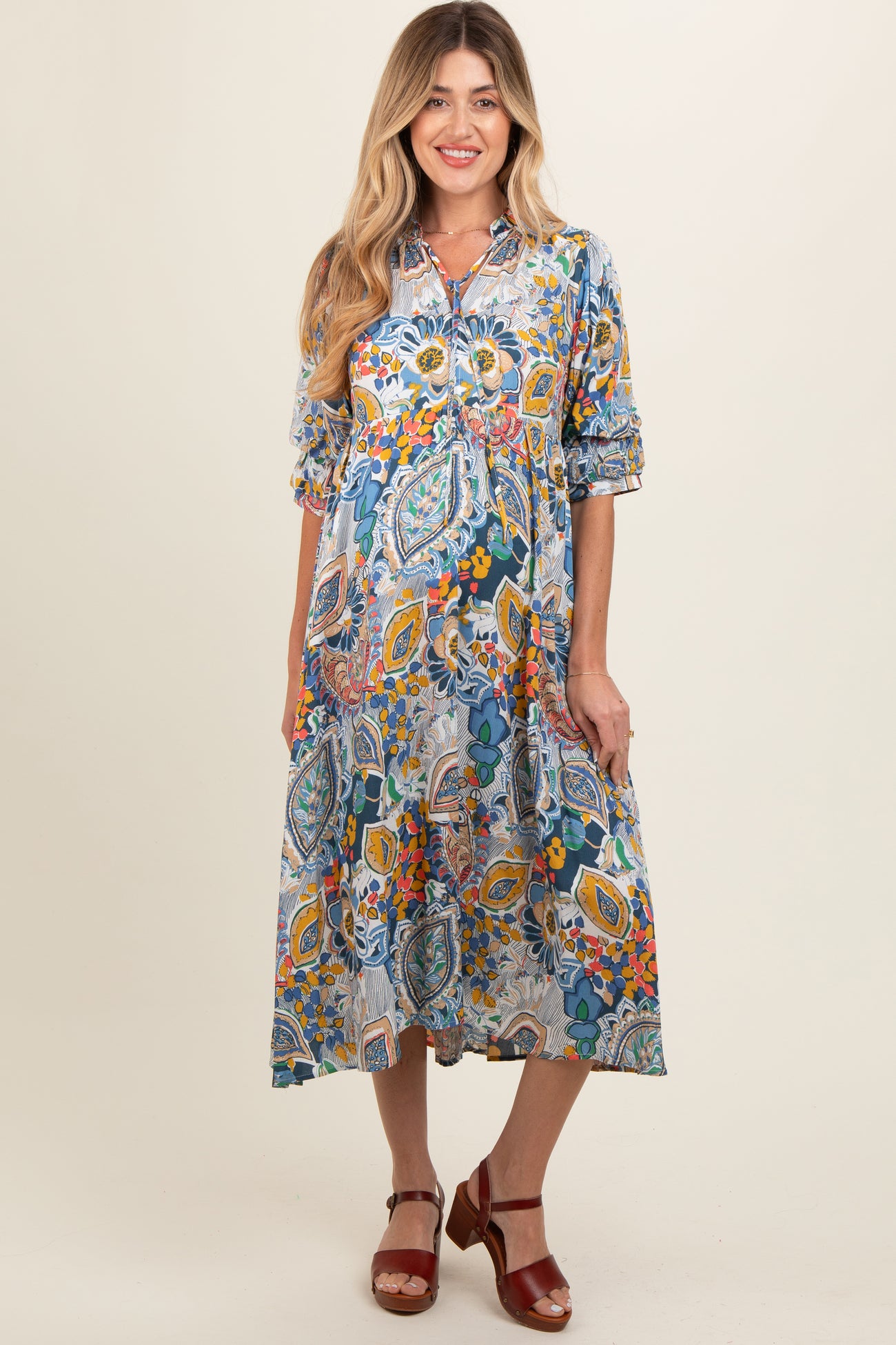 Blue Paisley Print Tiered A-Line Maternity Midi Dress