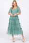 A mesh maxi dress featuring a ruffled tiered skirt, a smocked top, short flutter sleeves and a square neckline.