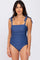 A solid hue swimsuit, featuring a straight neckline, adjustable shoulder tie straps, ruched sides, a double lining and removable padded cups.