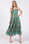 A printed maxi dress featuring a v-neckline with ruffle trim, an adjustable tie and a tiered skirt.