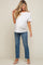 A pair of straight leg maternity jeans with an elastic belly band and 5 pockets.
