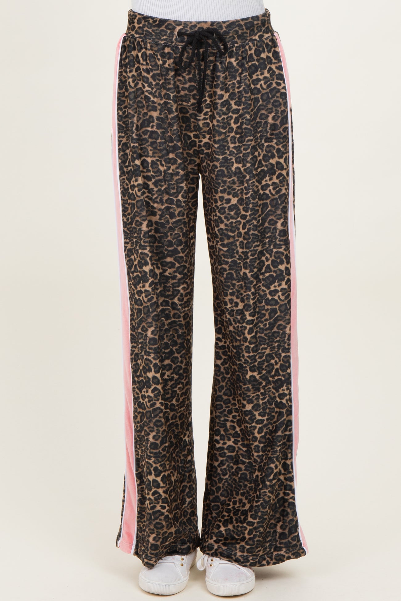 Step up your loungewear game with these Brown Animal Print Velour Track Pants. Featuring a bold leopard print design with a subtle pink side stripe, these pants combine trendy style with ultimate comfort. Crafted from soft, plush velour fabric, they offer a cozy yet breathable fit perfect for relaxing days or casual outings. The elastic waistband with adjustable drawstring ensures a customizable and comfortable fit. Pair with a simple tee or sweatshirt for an effortlessly chic look. Available in multiple sizes, these pants are a must-have staple for animal print lovers seeking comfort and style.