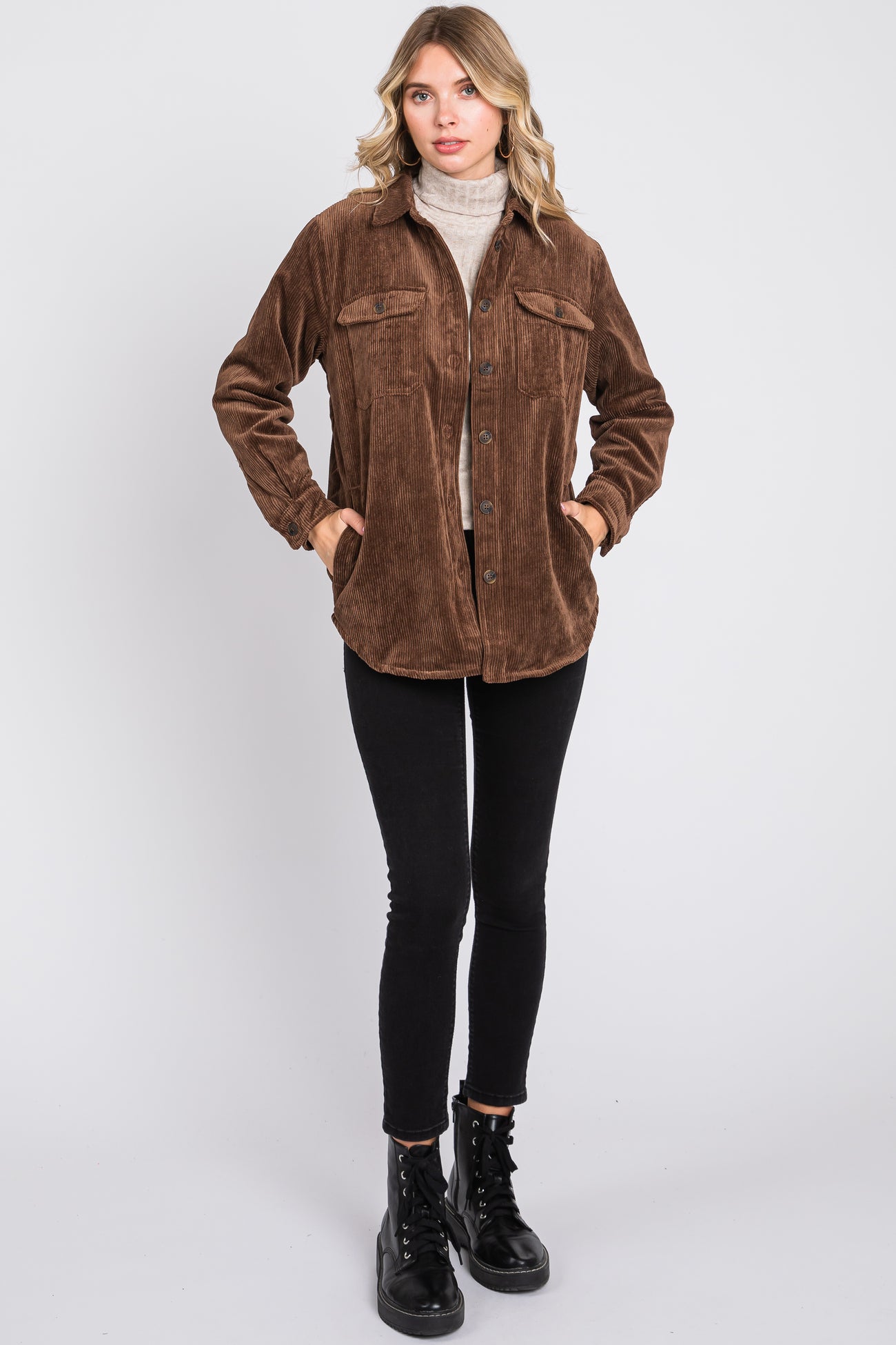 Brown Corduroy Plaid Fleece Lined Button Down Shacket