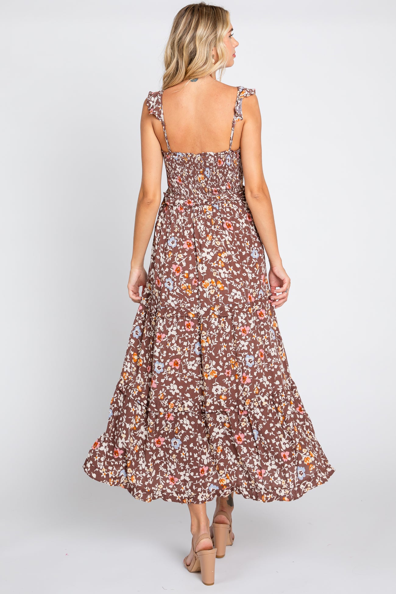Brown Floral Cinched Tiered Midi Dress