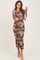 Brown Floral Mesh Overlay Ruched Midi Dress
