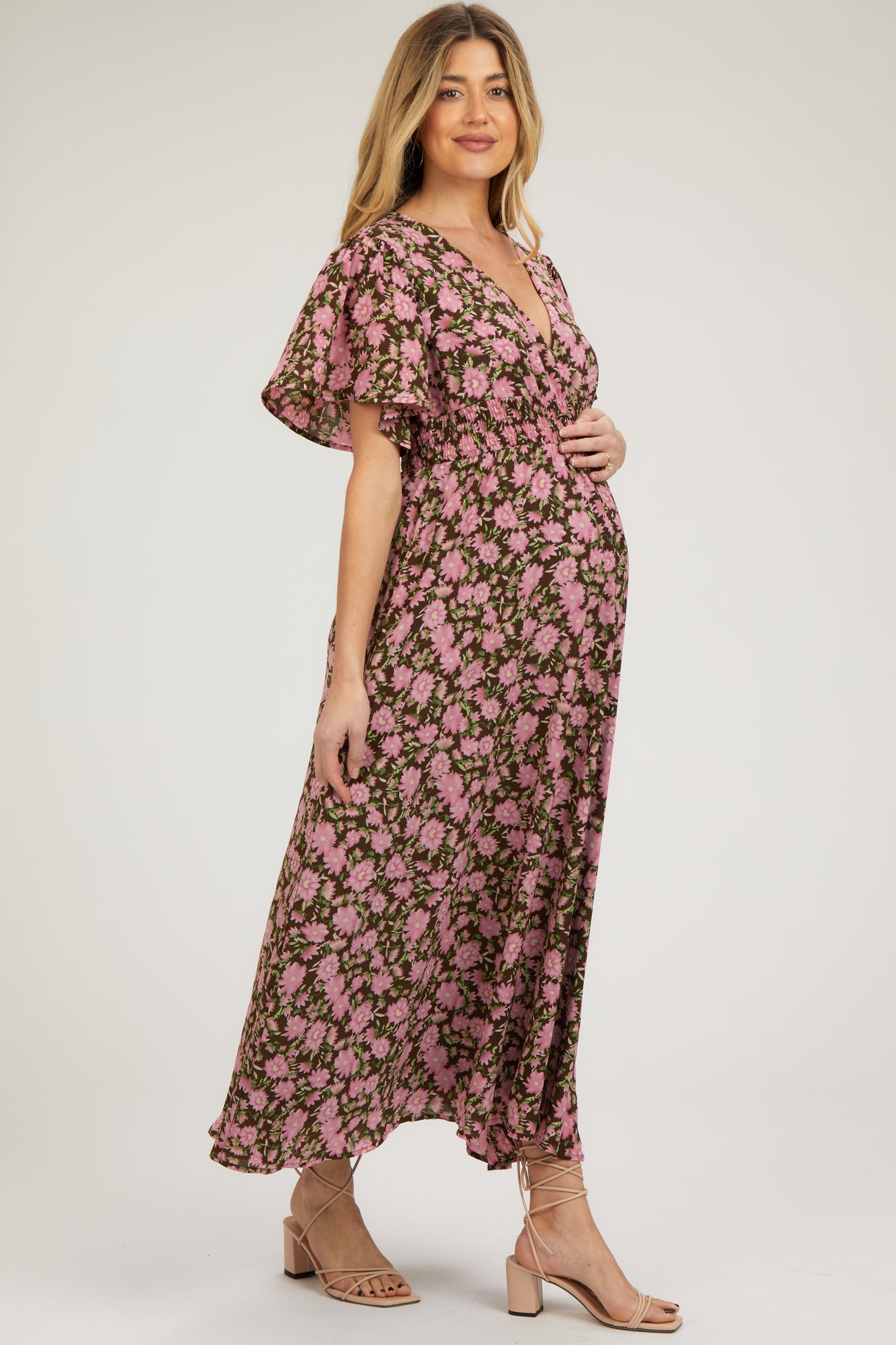 Brown Floral Smocked Waist Maternity Maxi Dress