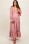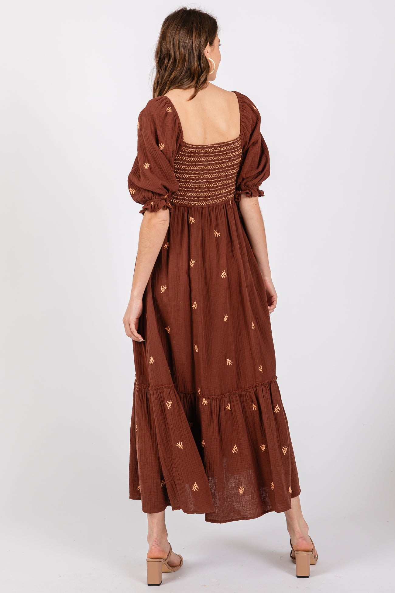Brown Gauze Smocked Embroidered Square Neck Midi Dress