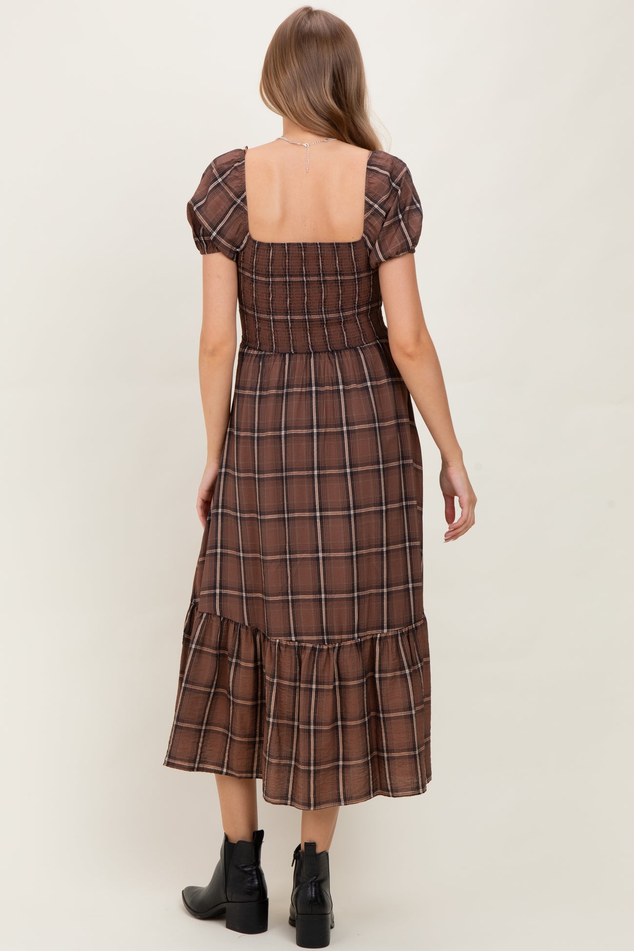 Brown Plaid Smocked Puff Sleeve Maternity Midi Dress