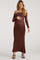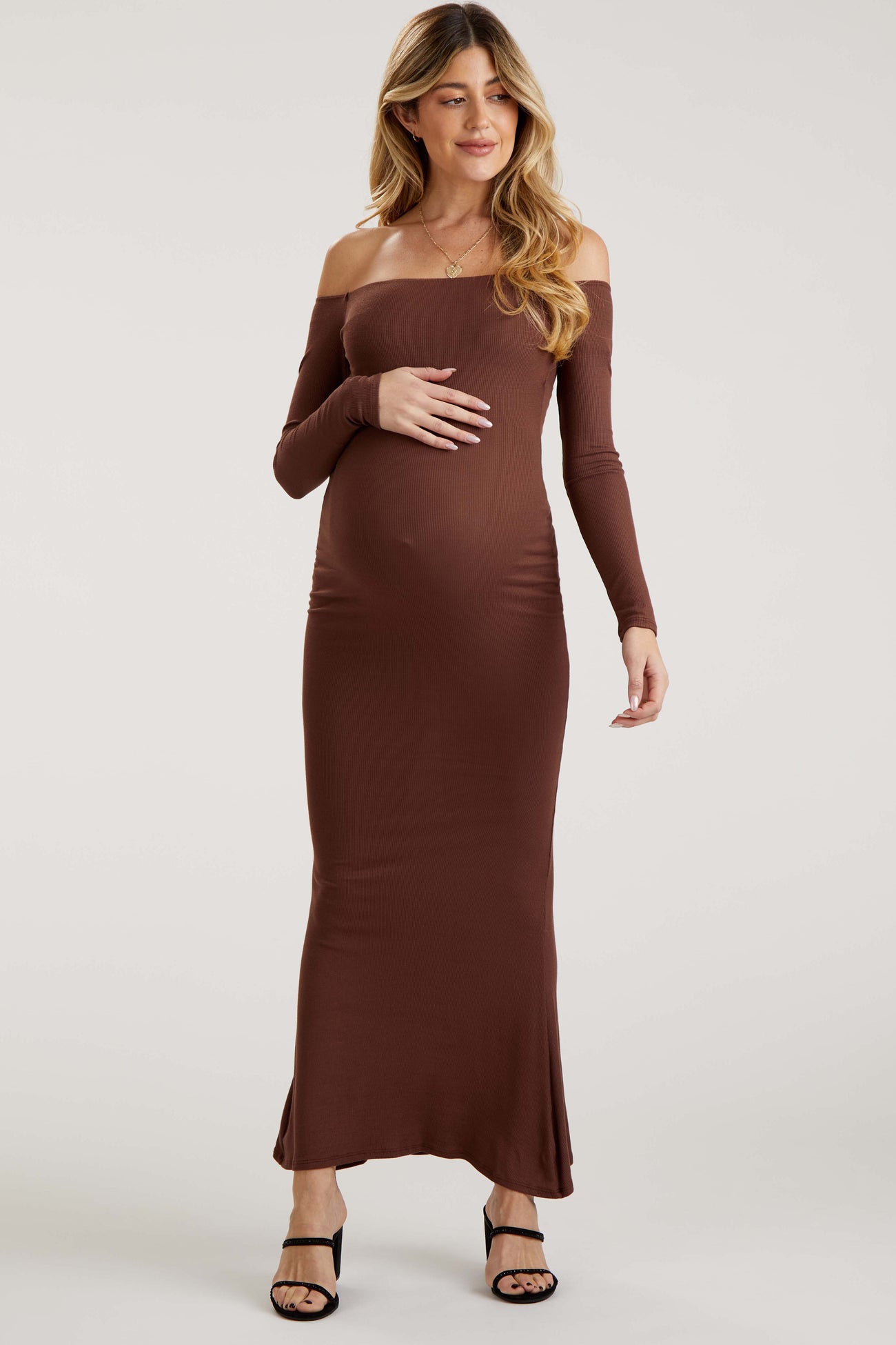 Brown Ribbed Off Shoulder Long Sleeve Maternity Maxi Dress