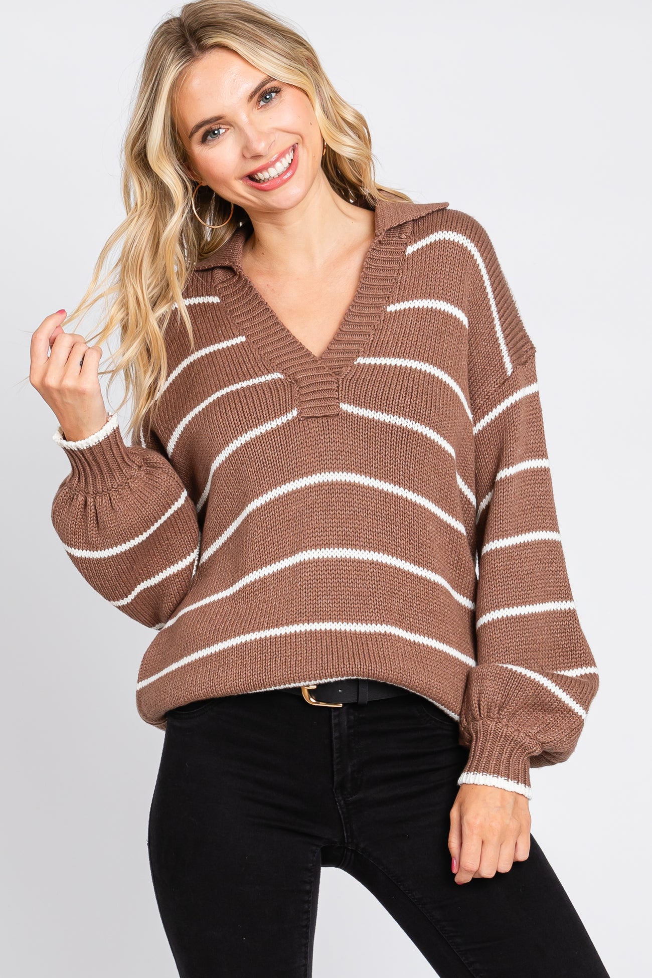 A striped sweater featuring a collared v-neckline and long puff sleeves.