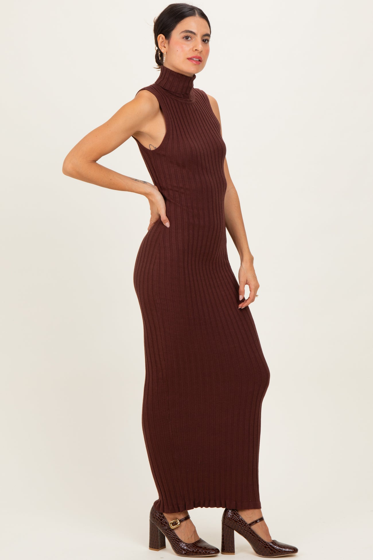 Brown Turtleneck Ribbed Knit Sleeveless Maxi Dress