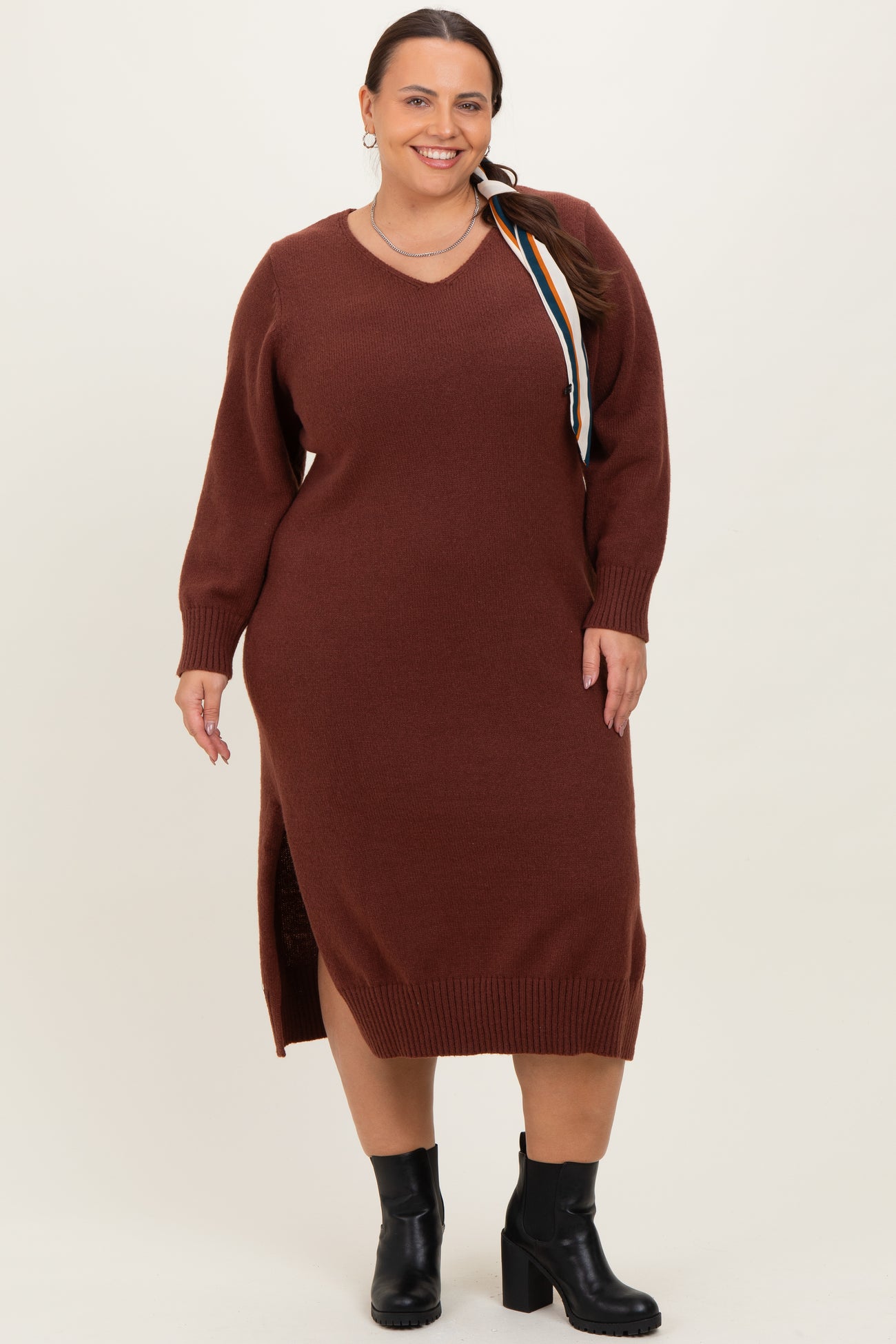 Brown V-Neck Relaxed Fit Maternity Plus Sweater Dress