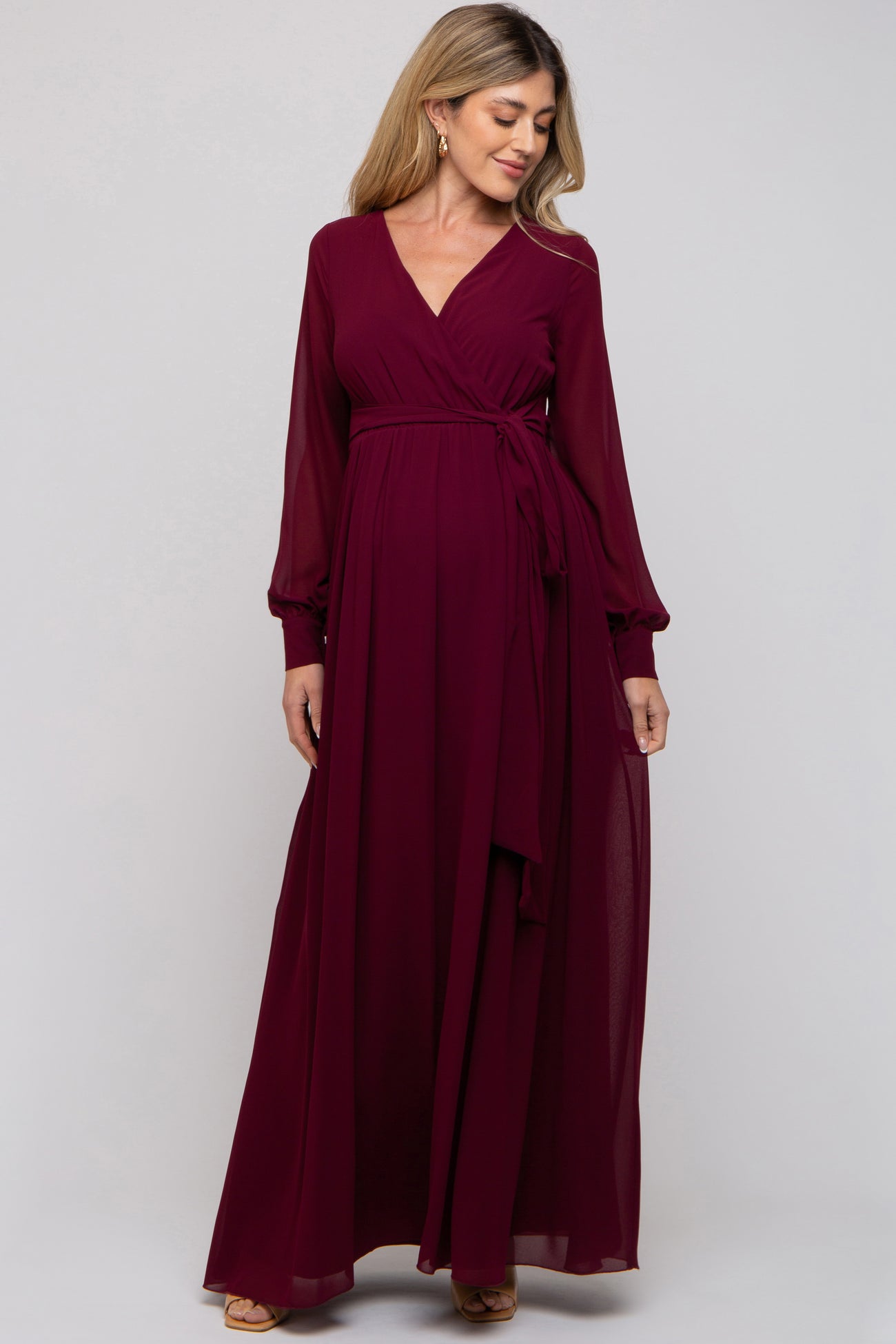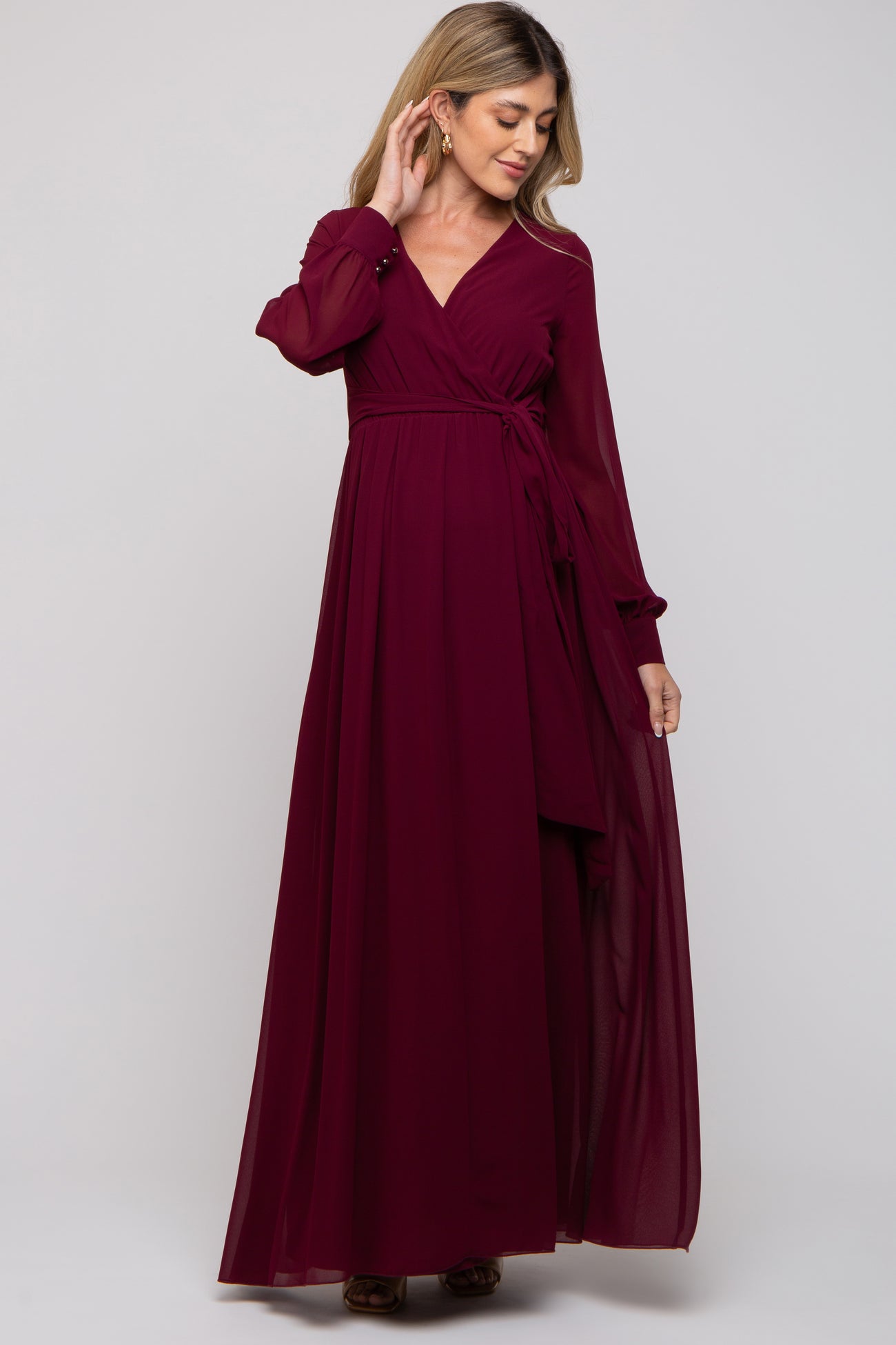 A solid chiffon maternity gown with semi sheer sleeves, wrap neckline and sash tie waist. Dress is lined.