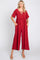 A solid hued cropped jumpsuit featuring wide legs, a crisscross neckline, side pockets and short sleeves.