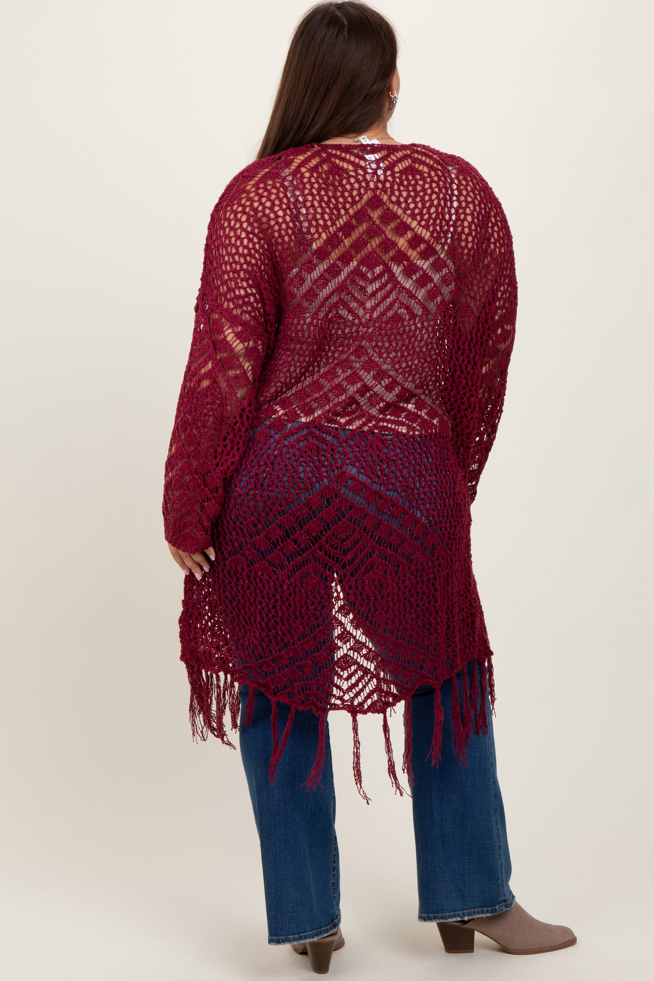 Burgundy Crochet Fringe Hem Plus Cardigan