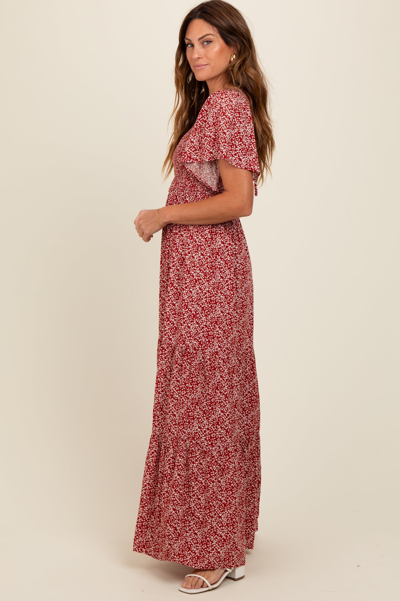 Burgundy Floral Smocked Flutter Sleeve Maxi Dress