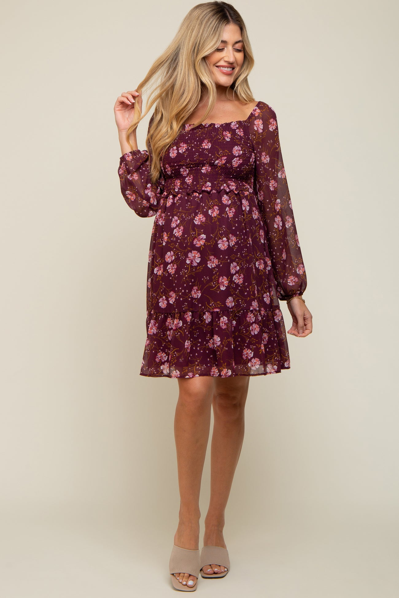 Burgundy Floral Smocked Long Sleeve Maternity Dress
