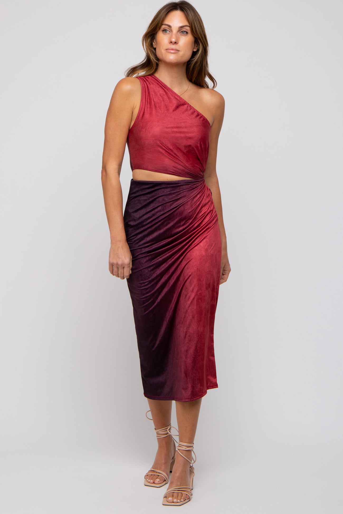 Burgundy One Shoulder Side Cutout Ruched Midi Dress