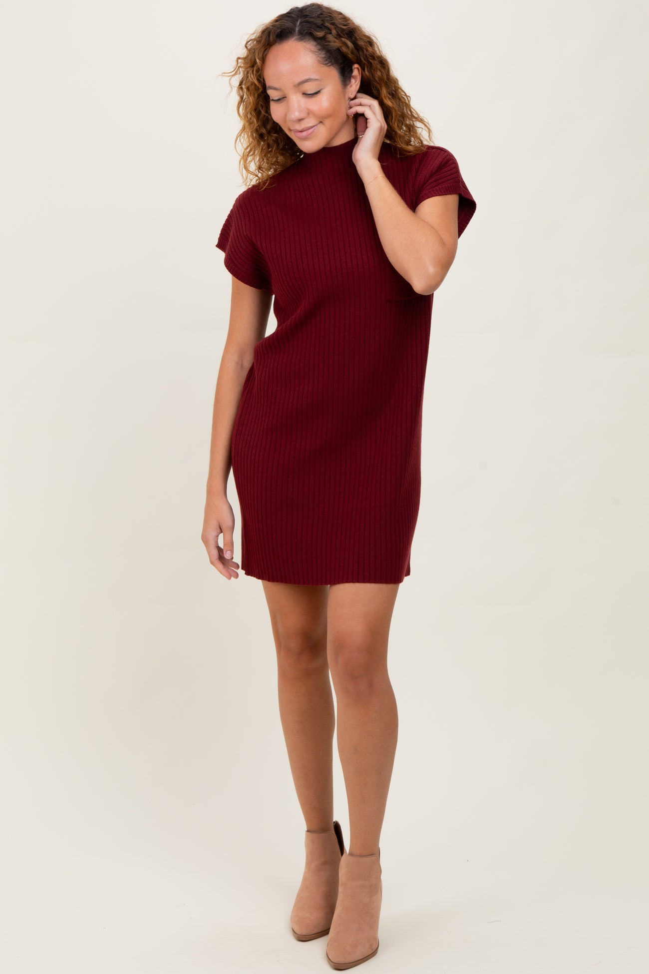 Burgundy Ribbed Knit Maternity Short Sleeve Sweater Dress