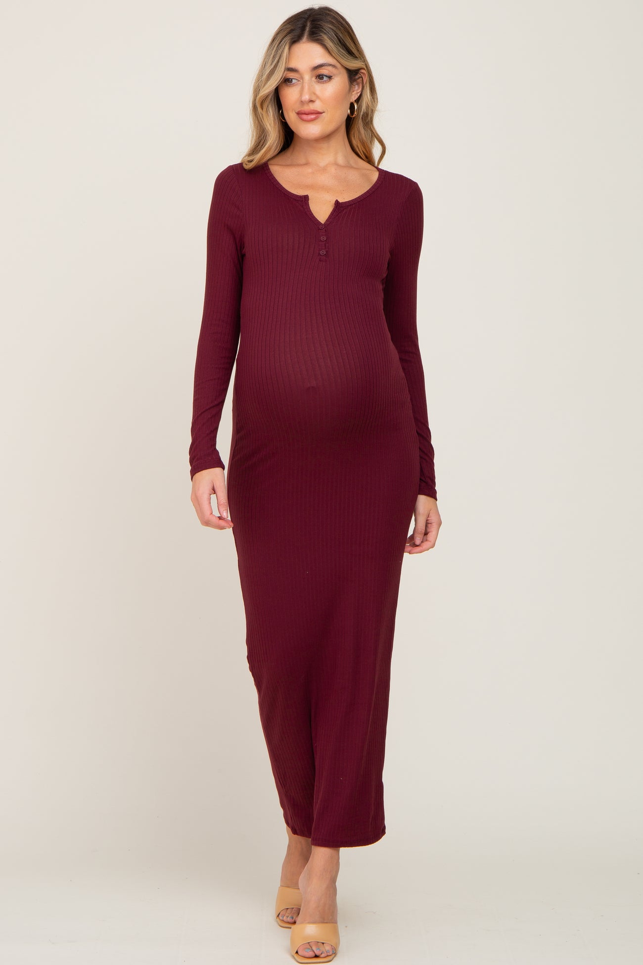 Burgundy Ribbed Long Sleeve Maternity Maxi Dress