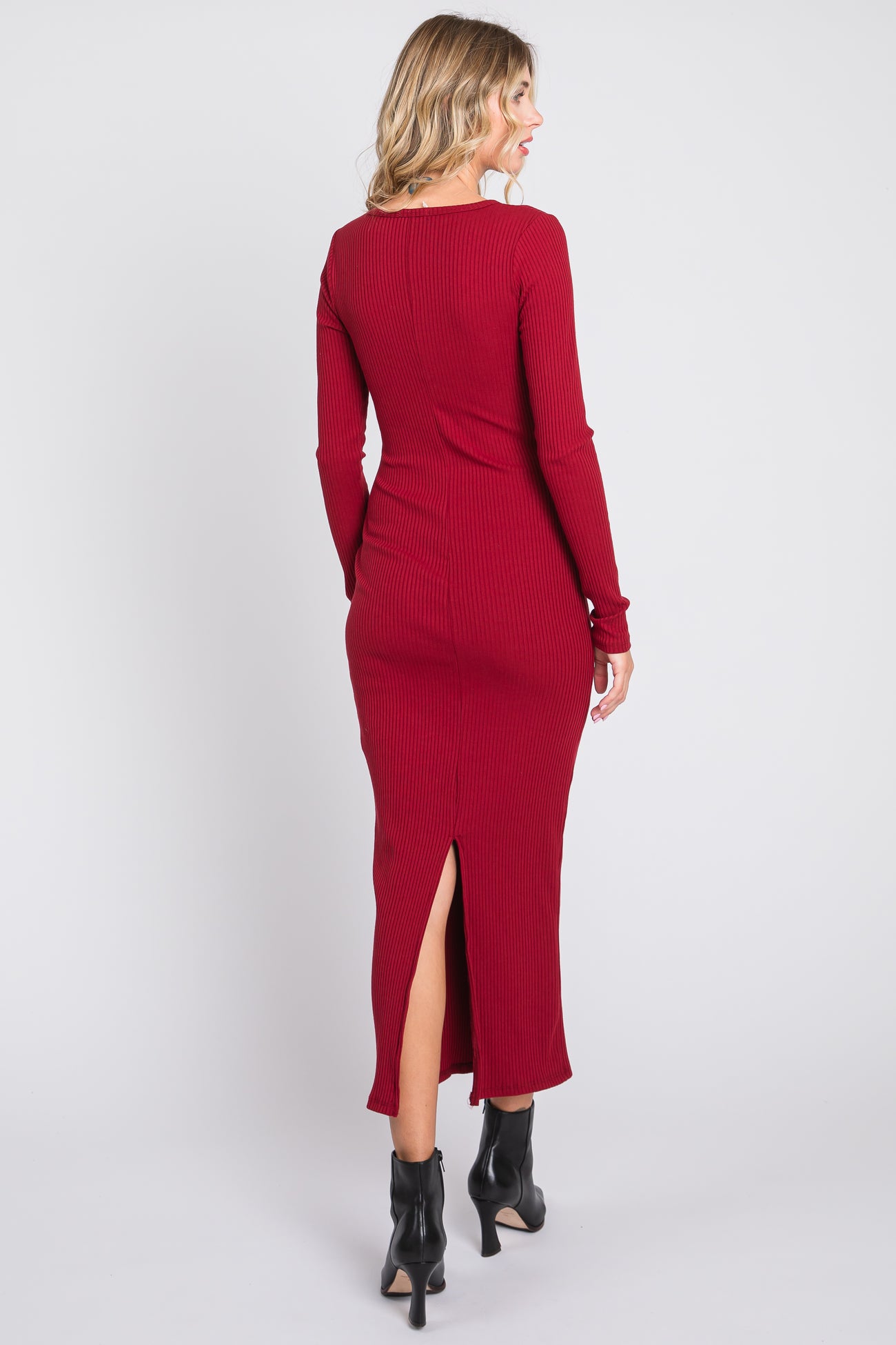 A solid ribbed maxi dress featuring a back slit, long sleeves and a v-neckline.