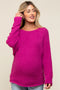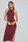 A rib knit midi dress with a rounded high neckline and a side slit.