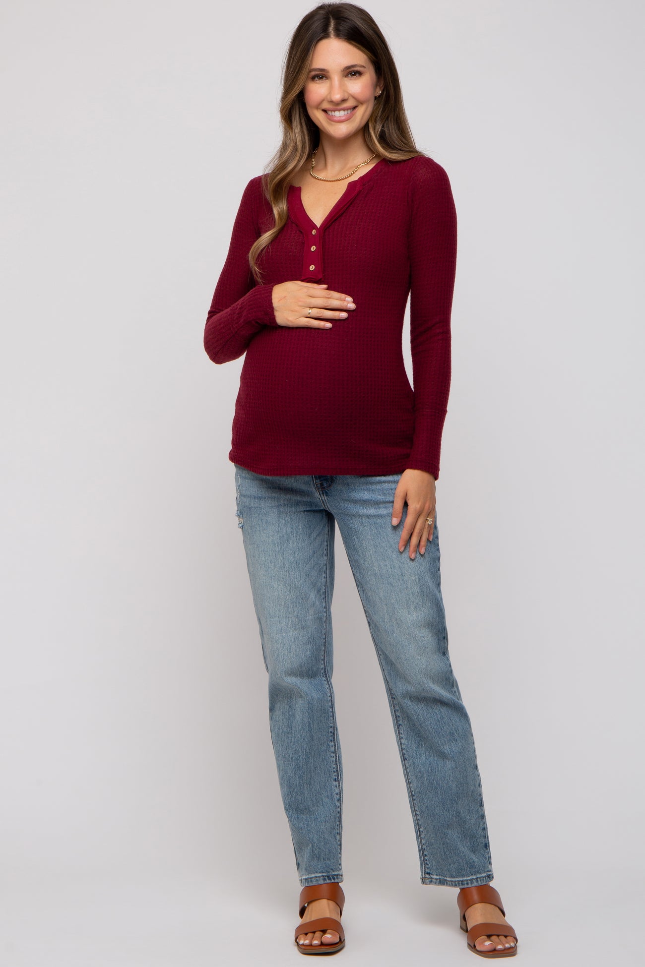 Burgundy Soft Waffle Knit Button Accent Long Sleeve Maternity Top