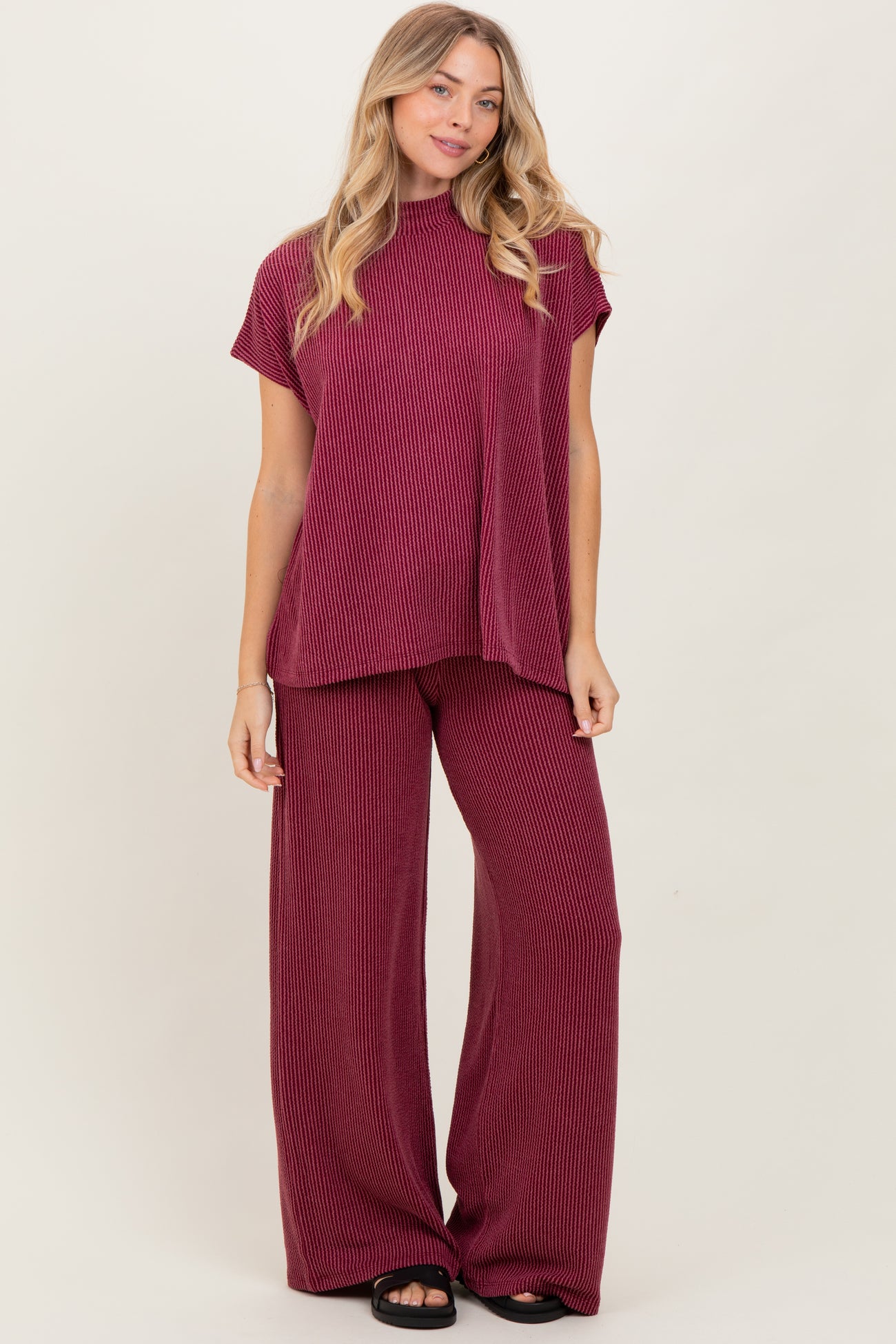 Burgundy Textured Rib Mock Neck Short Sleeve Pant Maternity Set