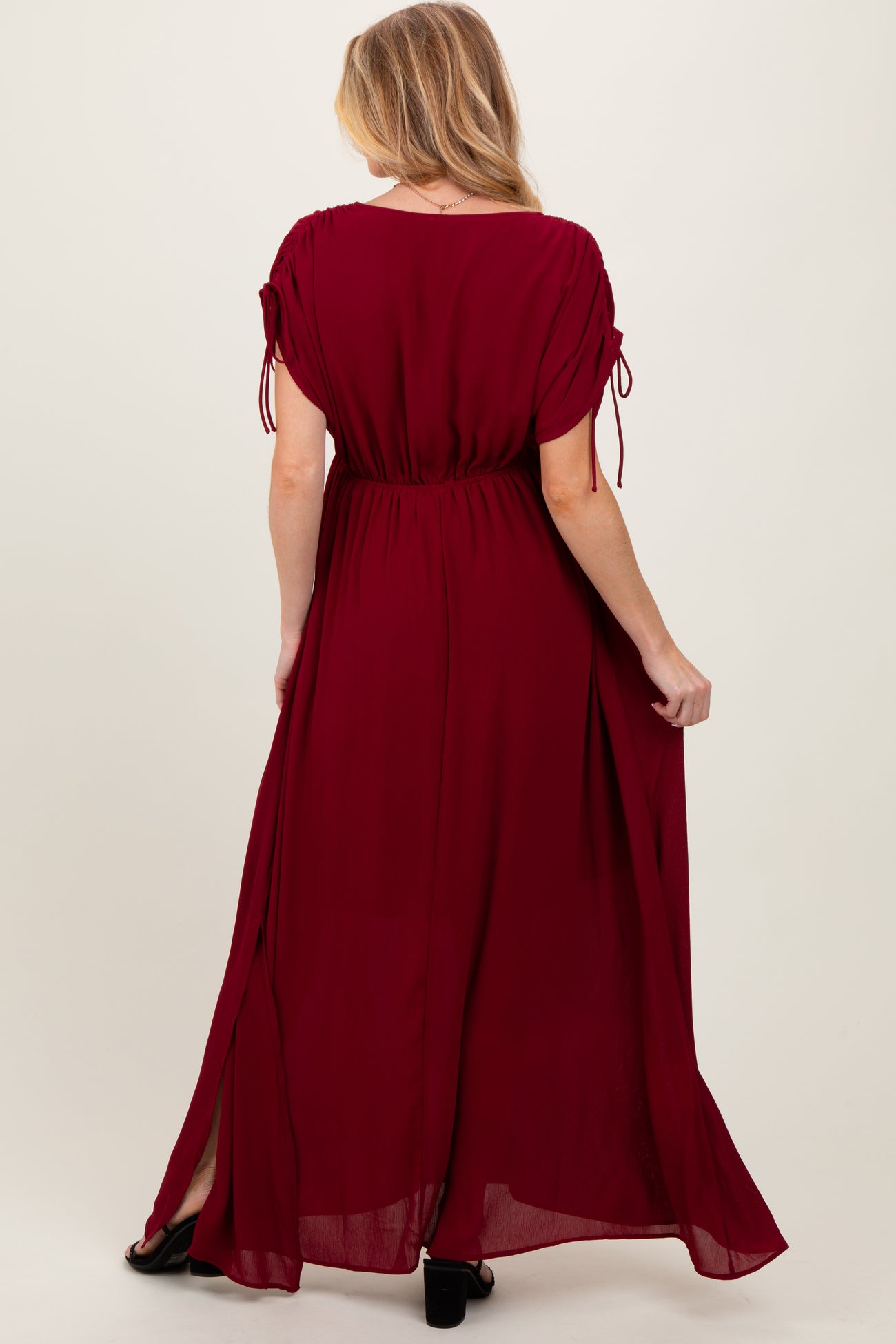 Burgundy V-Neck Drawstring Short Sleeve Side Slit Maternity Maxi Dress