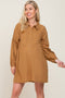 A solid hue dress featuring long raglan sleeves, a collar, functioning front buttons, and side pockets. Dress is lined for coverage.