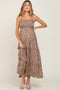 A floral sleeveless maxi dress featuring self-tie shoulder straps, a smocked top, a tiered skirt, side pockets and a square neckline.