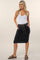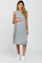 Heathered maternity skirt with an elastic waistline, two side pockets, an animal print accent, and a rounded hemline.