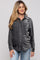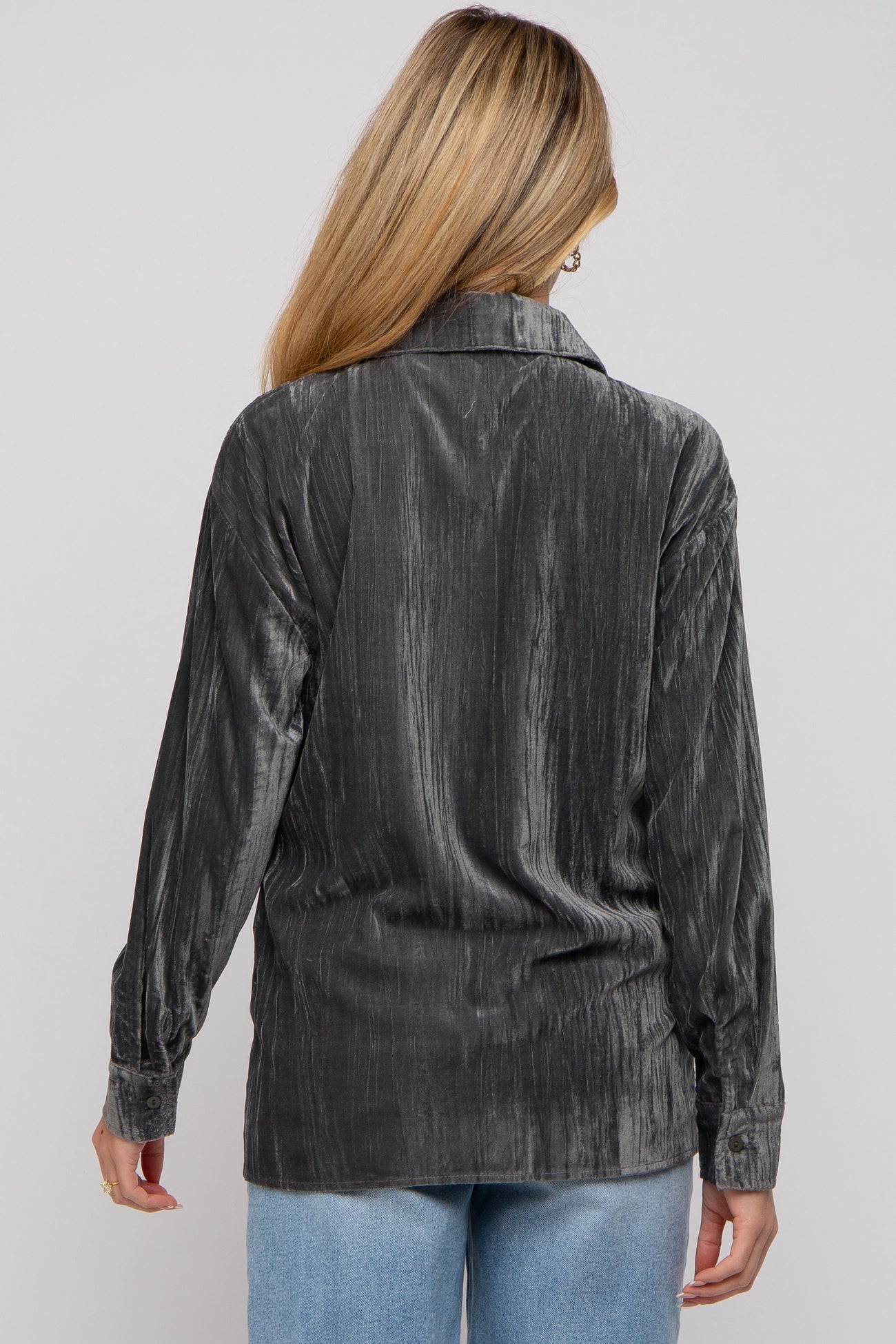 A pleated velvet maternity top featuring a collared neckline, a button up front, two front pockets and long sleeves.