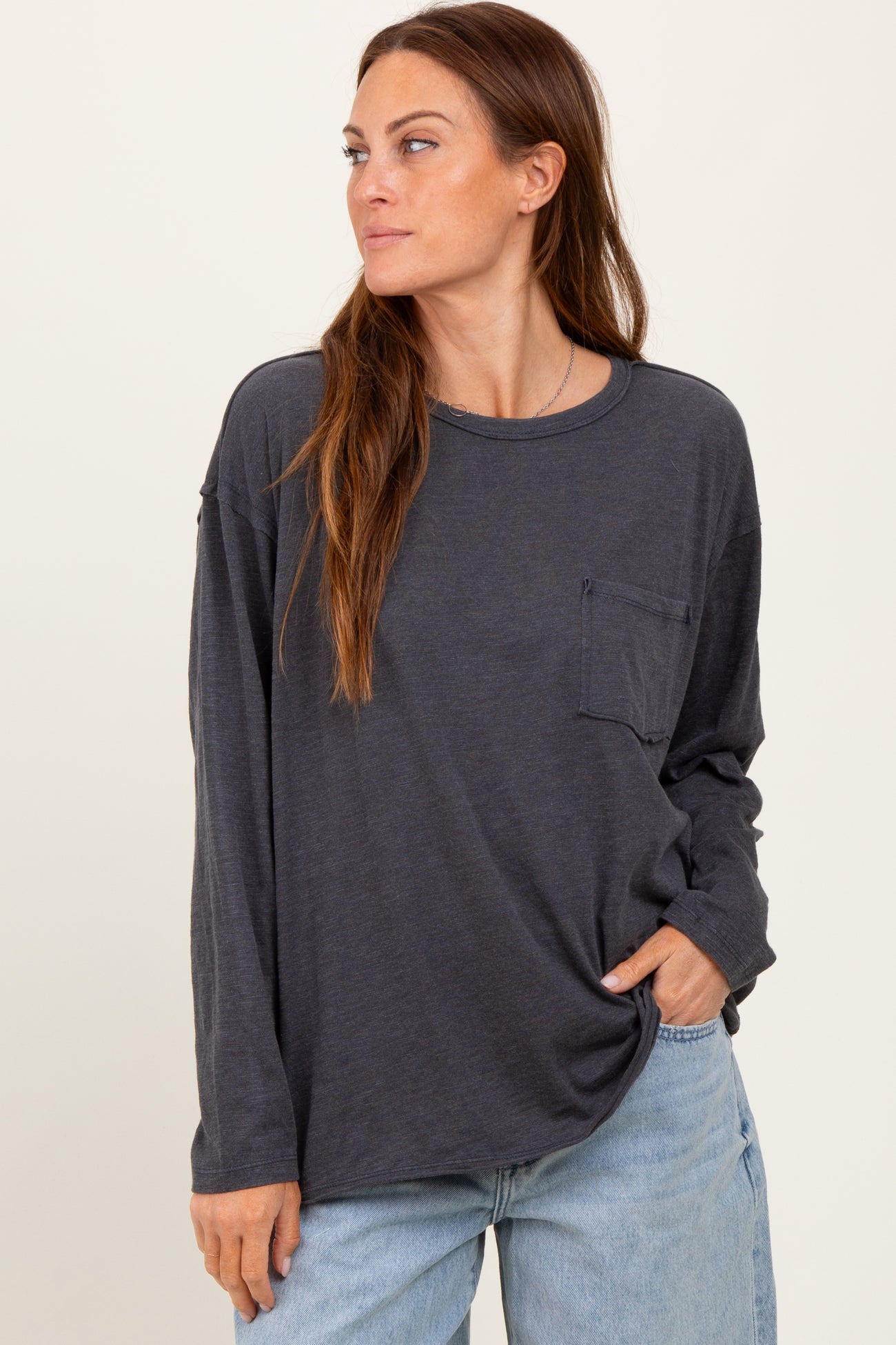 Charcoal Mineral Wash Front Pocket Long Sleeve Top