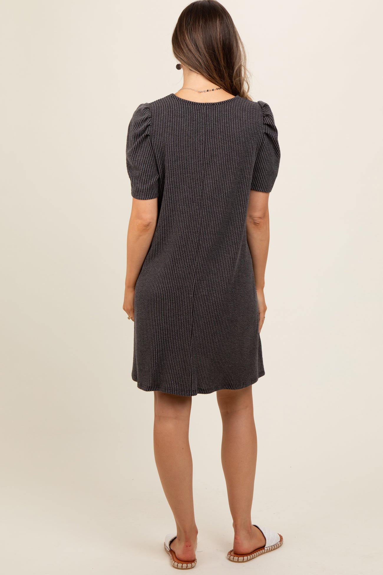 Charcoal Washed Ribbed Puff Sleeve Maternity Dress