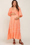 A floral midi dress with a squared neckline, 3/4 length sleeves, a smocked top, a tie back, and a gathered bottom tier.