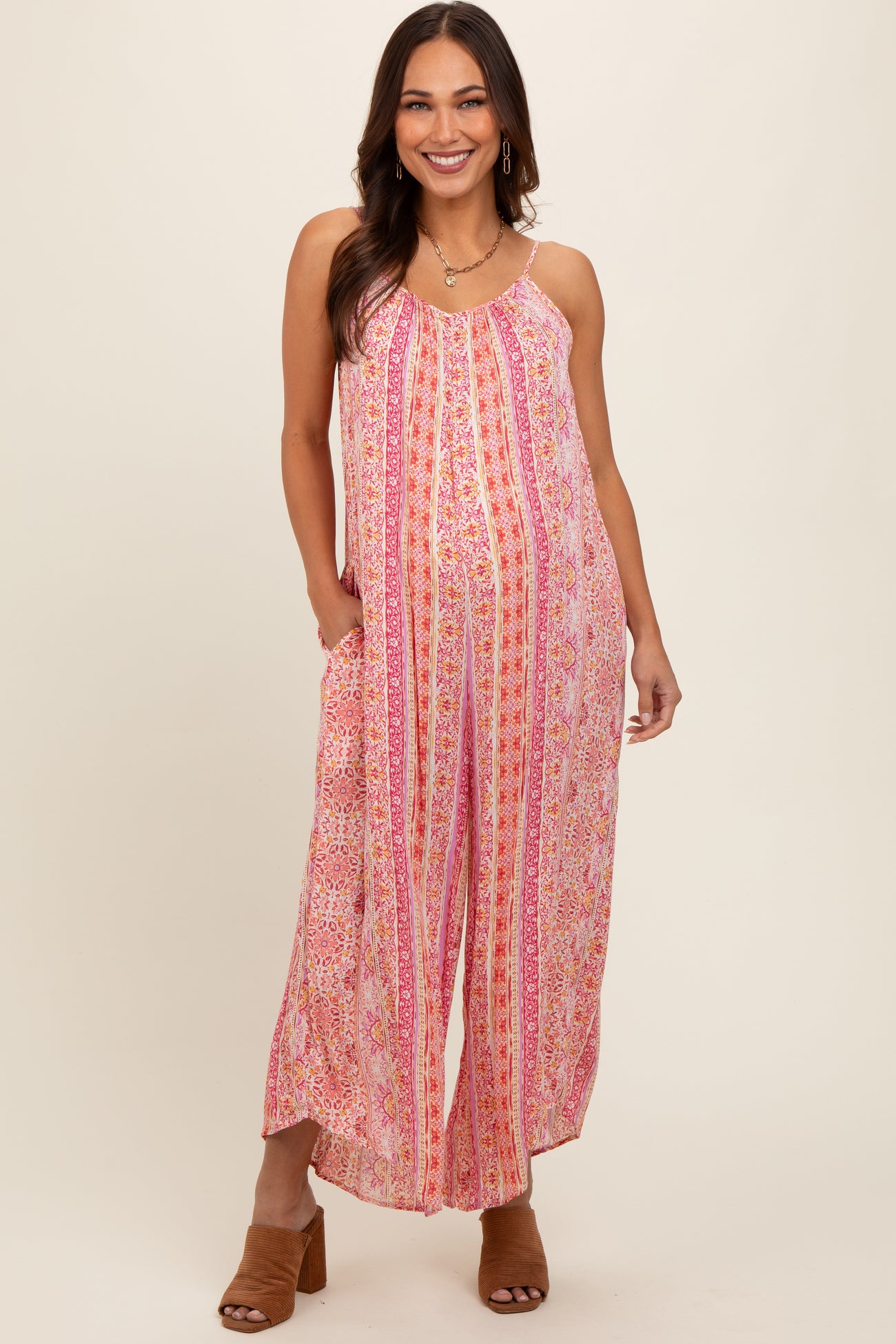A floral striped maternity jumpsuit with a scoop neckline, adjustable straps, side pockets, and asymmetrical pant legs.