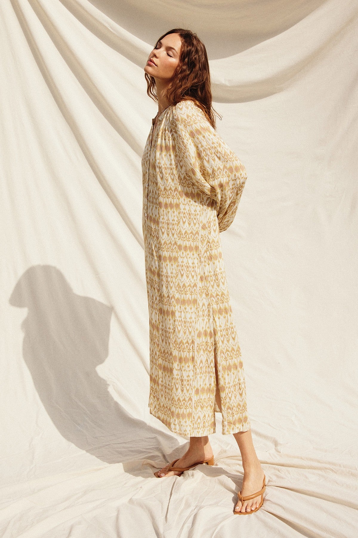 A printed maternity midi dress featuring a split v-neckline, 3/4 length puff sleeves, a button front with an adjustable tassel tie, side slits and a slight hi-low hem.